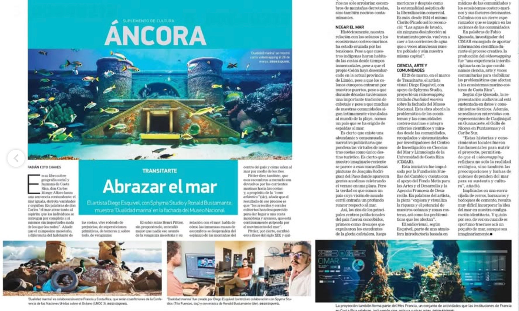 Para la creación del contenido, realizamos sesiones de trabajo con Fabio Quesada del CIMAR, quien nos proporcionó una serie de insumos científicos sobre la situación actual de la zonas marino-costeras de Costa Rica. La pieza fue presentada en el marco del Transitarte 2025.